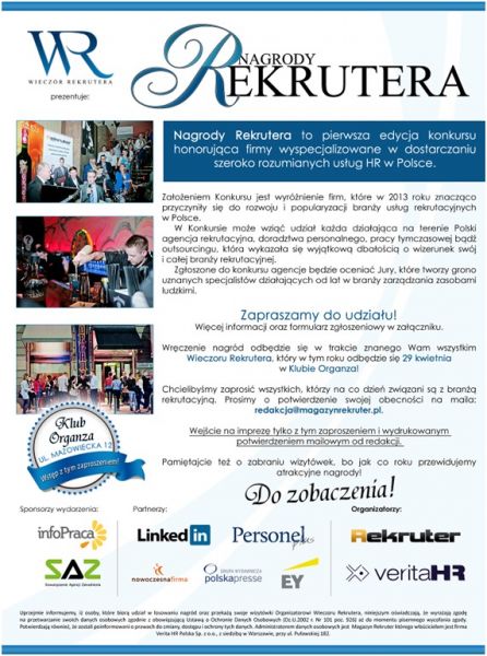Nagrody Rekrutera to pierwsza edycja konkursu honorująca firmy wyspecjalizowane w dostarczaniu szeroko rozumianych usług HR w Polsce.
